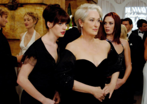 Los colores del vestuario de la película también juegan un papel fundamental. En la primera mitad del film, Andy usa tonos oscuros y apagados, reflejando su falta de conexión con el mundo de la moda. A medida que evoluciona, su paleta de colores se vuelve más sofisticada, con tonos neutros, dorados y detalles llamativos que denotan confianza y poder. Miranda Priestly, por su parte, mantiene un vestuario dominado por colores fríos y elegantes, reafirmando su personalidad imponente y calculadora.