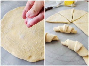 - Luego, cortaremos triángulos de 10 cm de ancho y los enrollaremos formando las medialunas. Las pintamos con huevos y las dejaremos levar un poco.