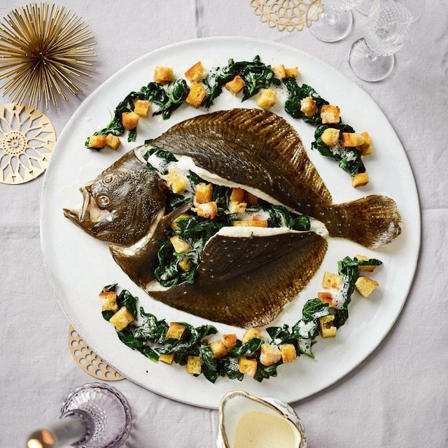 - Servir el rodaballo con las espinacas y los picatostes como guarnición.