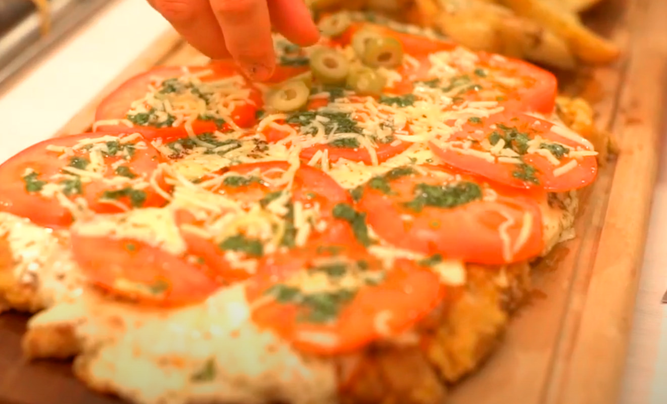 Ponemos a cocinar la milanesa en el horno y cuando le quedan pocos minutos para que esté lista, es hora de los últimos ingredientes. Hay que completarla. Podemos hacer los típicos “rellenos” de las pizzas que conocemos: muzzarella, especial, napolitana, calabresa, etcétera. O simplemente innovar uno nuevo.
