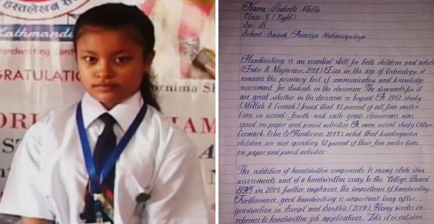 Nepal es un país que se encuentra en Asia del Sur, en ese lugar se encuentra una estudiante de nombre Paktriki Malla, quien con solo 14 años de edad ha sido la ganadora del cotizado premio de la “Mejor Caligrafía del Mundo”, esto debido a que su letra a mano alzada parece un texto impreso por una computadora.
