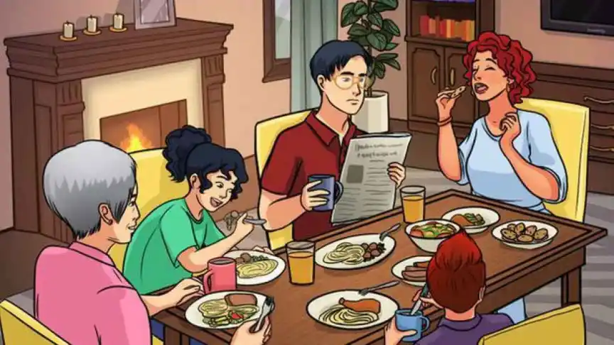 El reto de hoy consiste en encontrar el error presente en la imagen que te dejaremos a continuación, y para ello, tendrás que prestarle muchísima atención a los detalles, ya que esta imagen aparenta ser de fácil resolución, no lo es para nada. En la ilustración podrás ver lo que parece ser una familia convencional disfrutando de una comida: Madre, padre, hijos y la abuela.