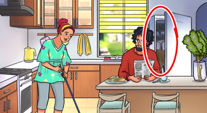 El error esta en la heladera, ya que ahí se encuentra guardado las escobas, cosa que en el mundo real es totalmente ilógico. ¿Cuánto tiempo te tomó resolver? Esperamos que hayas disfrutado resolviendo este rompecabezas en particular.