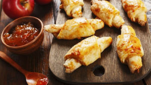 - Corta la masa en triángulos, rellena con jalea y enrolla.