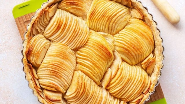 - Vierte la crema pastelera y coloca las láminas de manzana encima.