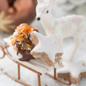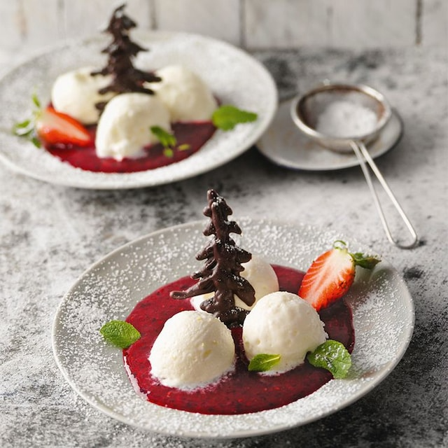 4. Sirve el helado sobre el coulis y decora con los árboles de chocolate, azúcar glas y menta.