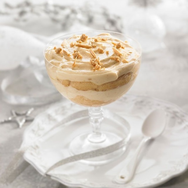 Este tiramisú navideño incorpora el turrón como protagonista, mezclándolo con mascarpone y bizcochos empapados en licor.