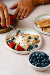 - Rellena o acompaña con fruta, crema de cacao, frutos secos o helado vegano.