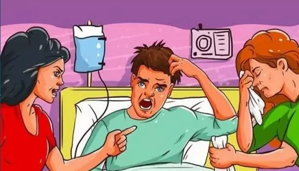 Es más lógico pensar que la mujer de rojo es la esposa del paciente, ya que ella le insulta, en las parejas esto a veces puede pasar. Pero trata de dejar toda lógica y echar un vistazo a los detalles.