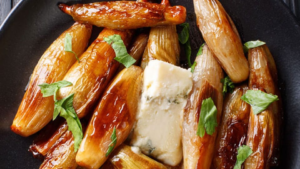 Esta receta es ideal para acompañar carnes o para servir como aperitivo. La combinación de echalote caramelizado y queso azul es una verdadera delicia para el paladar.