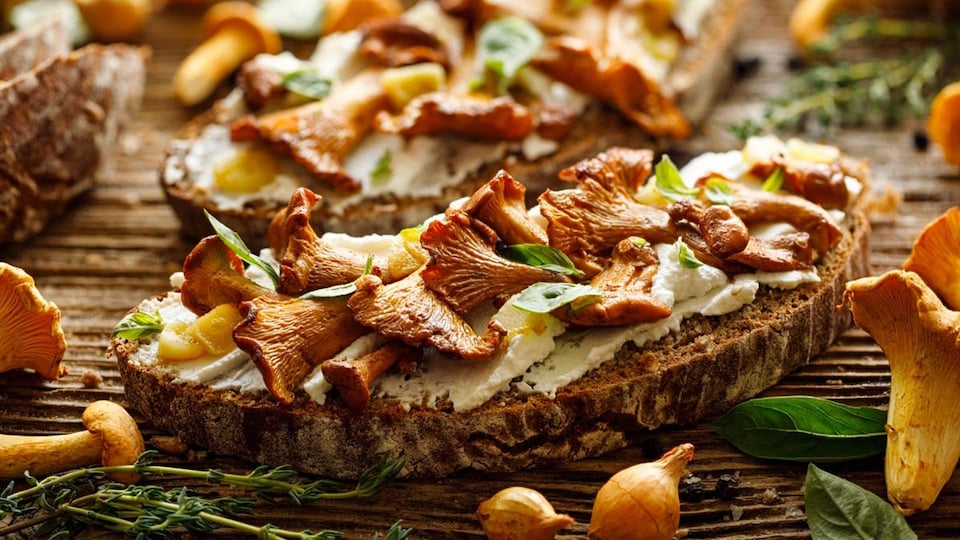 - Coloca los rebozuelos con echalote sobre el pan y decora con hierbas aromáticas.