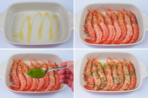 • Coloca los gambones en una bandeja apta para horno. Píntalos con un poco de aceite de oliva virgen extra utilizando un pincel de cocina.