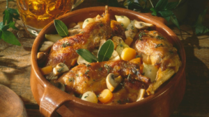 Muslos de conejo asados con limón y piñones