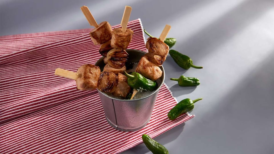 - Ensártalos en brochetas alternando con pimientos y cebollitas.