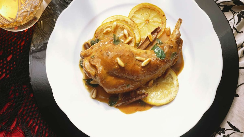 Muslos de conejo asados con limón y piñones