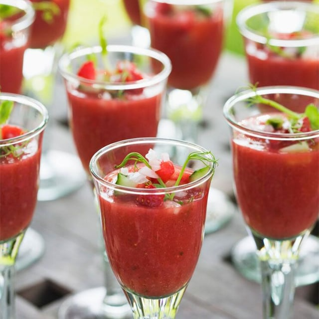 El gazpacho tradicional tiene múltiples versiones, y una de las más refrescantes es la que incorpora fresas. Se mezcla con tomate, pimiento, pepino, aceite de oliva y un toque de vinagre. La fresa aporta un sabor frutal que suaviza el conjunto y lo hace especialmente agradable en días calurosos. Servido en vasitos pequeños, es perfecto como entrante o aperitivo en reuniones informales.