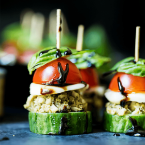 Bocados Caprese de pepino con atún y pesto