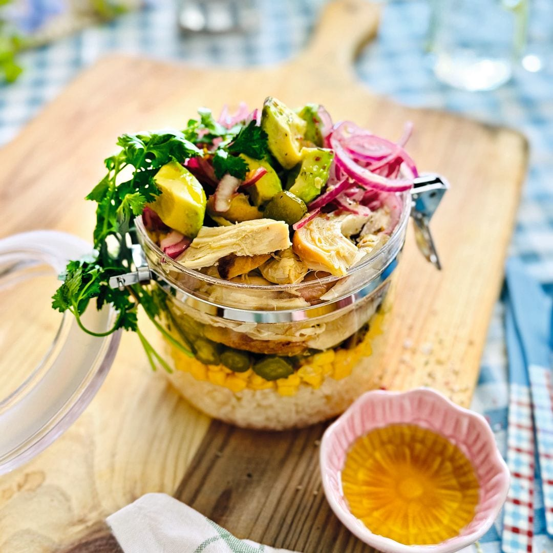 Te proponemos tres opciones que cumplen con todo lo necesario para ser las reinas del pícnic playero: una ensalada de pollo asado en tarro, unas samosas especiadas al horno con salsa de yogur y un sándwich de berenjena asada y queso provolone. Son frescas, sabrosas, fáciles de transportar y perfectas para comer frente al mar sin complicaciones.