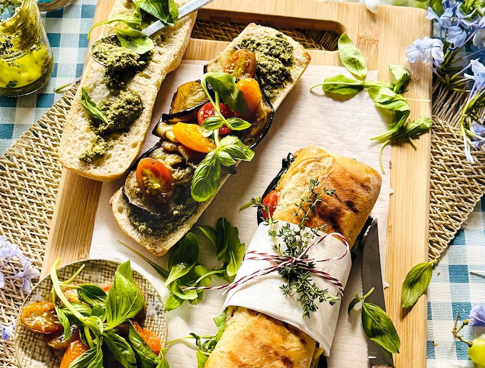 1. Sándwich de berenjena asada, tomates cherry y provolone