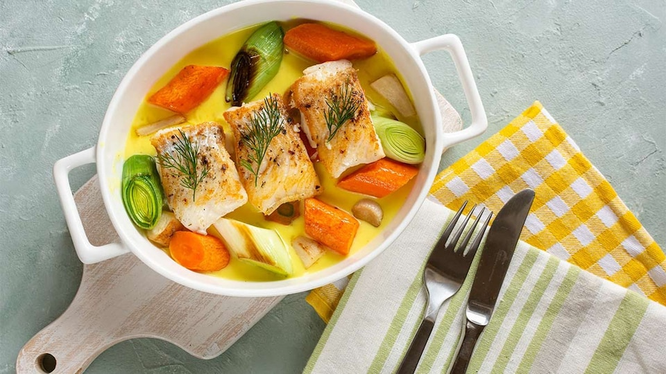 - Coloca las verduras sobre la salsa e incorpora el bacalao.