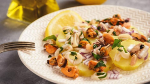 Ensalada de patatas, calamar y mejillones con vinagreta de limón