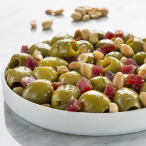 Si hay un aperitivo que no falta en ninguna barra de bar, son las aceitunas. En esta receta, se utilizan aceitunas gordal —grandes, carnosas y ligeramente amargas—, que se acompañan con finas lascas de mojama de atún y cacahuetes tostados. Esta combinación resulta sorprendentemente armónica: la intensidad marina de la mojama se equilibra con la grasa del fruto seco, mientras que el eneldo fresco añade un toque anisado muy agradable. Esta tapa es un homenaje al sur de España, especialmente a la zona de Andalucía, donde estos ingredientes son habituales.