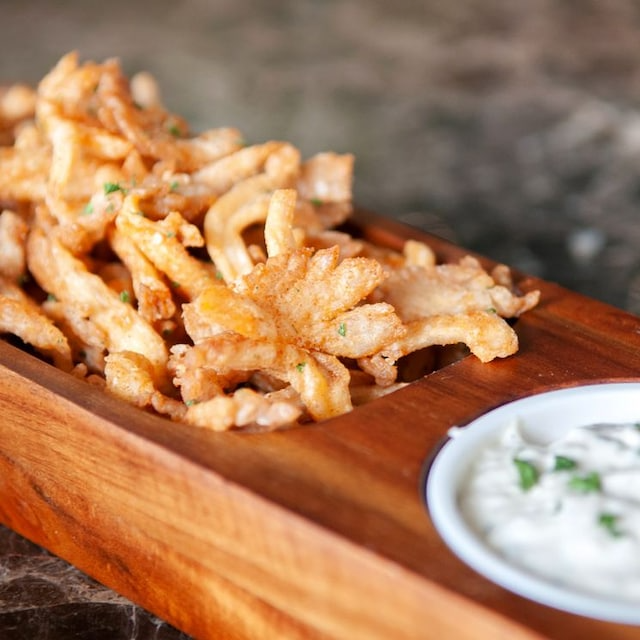 Los calamares fritos, también conocidos como calamares a la romana, son una tapa esencial en muchas cartas. En esta versión renovada, se cortan los calamares en tiras finas y se rebozan en una mezcla de harina de tempura, logrando una textura más ligera y crujiente. Se sirven con una salsa tártara casera, hecha con mayonesa, alcaparras, pepinillos, cebolla y un toque de mostaza. Esta combinación ofrece un bocado sabroso y diferente, que puede funcionar tanto como tapa como en un plato principal ligero. Además, es una excelente opción para quienes disfrutan de los fritos pero buscan un resultado menos pesado.