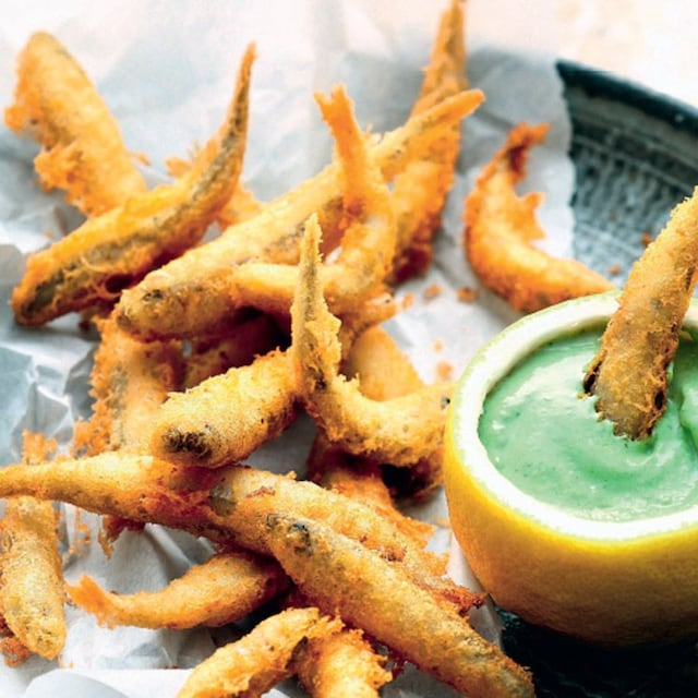 Los boquerones fritos, crujientes por fuera y jugosos por dentro, son un clásico de los chiringuitos y bares costeros. Esta receta mantiene la fritura tradicional, pero cambia la salsa de acompañamiento por un alioli aromatizado con albahaca fresca. Esta hierba le aporta un matiz herbáceo y fresco que complementa perfectamente al pescado. El resultado es una tapa más ligera y con un aroma que recuerda a los sabores mediterráneos. Puedes servir los boquerones en una pequeña cesta de papel de estraza para darle un toque informal y atractivo.