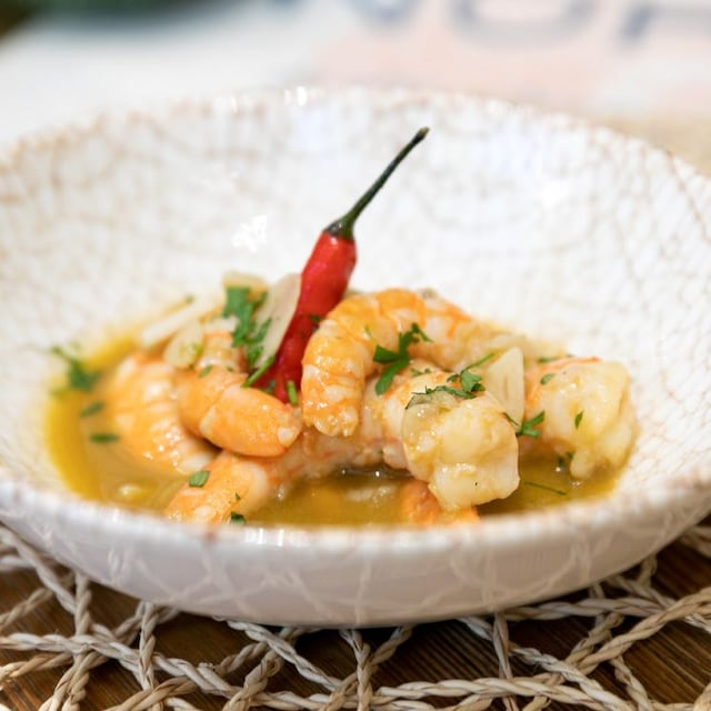 Las gambas al ajillo son una de las tapas calientes más populares. En esta versión actualizada, el chef David de Jorge propone utilizar langostinos en lugar de gambas y añadir chile para aportar un punto picante que realce el sabor. Además, incorpora un chorrito de brandy de Jerez, que al reducirse en la sartén crea un fondo aromático intenso y delicioso. Esta combinación convierte una receta clásica en una tapa más sofisticada, ideal para cenas especiales o para lucirse con invitados. El resultado es un plato con carácter, en el que el ajo, el picante y el licor se combinan de forma armoniosa.