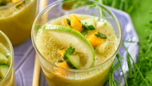 Pela el mango y el pepino. Reserva una parte de ambos para la decoración y tritura el resto junto con las cebolletas, el zumo de lima, sal, agua al gusto y un chorrito de aceite. Añade hielo si lo quieres bien frío. Sirve en vasos decorando con daditos de fruta, rodajas de lima y hojas frescas.