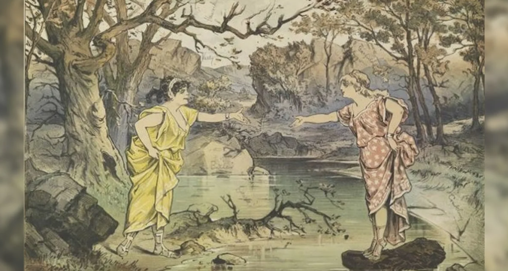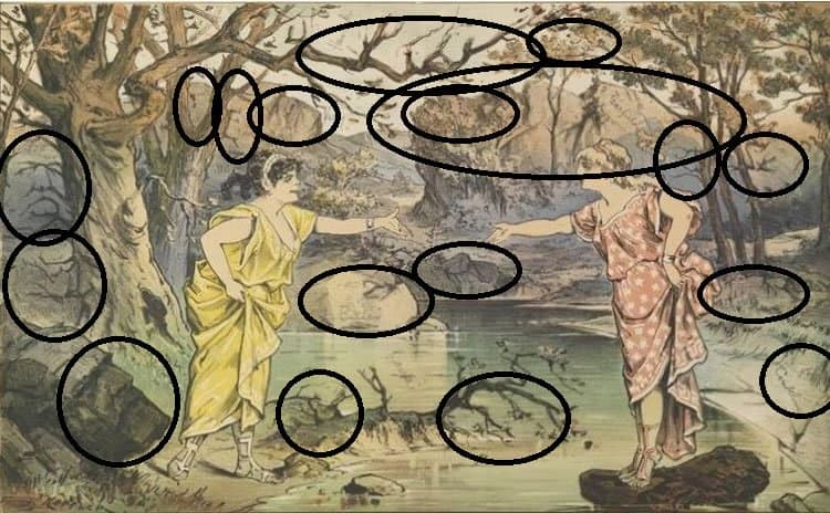 En la imagen de arriba, puedes ver a dos mujeres separadas por las aguas de un arroyo tratando de alcanzarse. Sin embargo, además de esta vista obvia, hay algunos secretos ocultos, más precisamente 18 caras ocultas en la imagen.