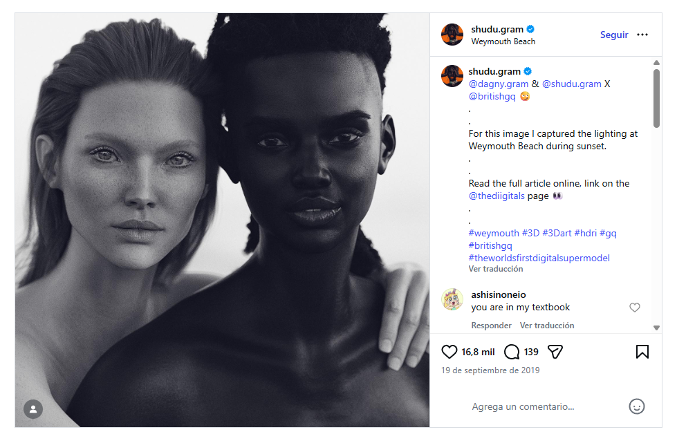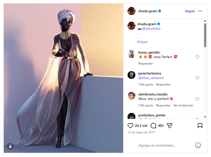Shudu es una modelo digital generada por computadora. Fue diseñada en 2017 por un hombre blanco de ahora 29 años llamado Cameron-James Wilson, quien desde entonces vive de las ganancias que produce la modelo, quien siendo la primera supermodelo digital, le ha ganado un nombre en la industria, además de mucho dinero. Aunque a simple vista estos hechos no parecen un problema, una mirada más cercana a la situación deja ver la preocupante realidad del futuro de la industria.