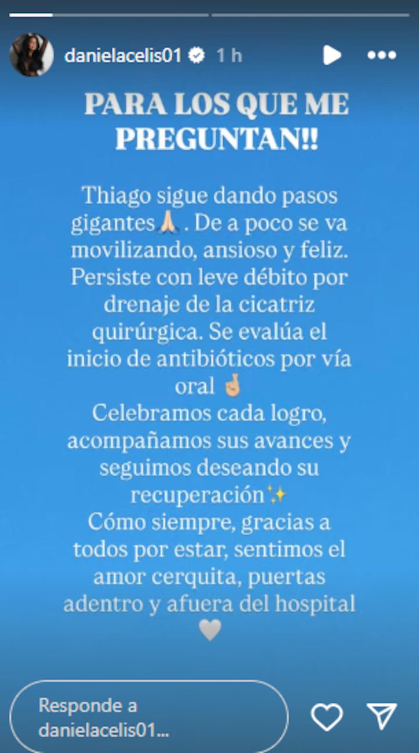 Actualmente, Thiago se encuentra internado en el Hospital Mariano y Luciano de la Vega, en el partido bonaerense de Moreno, donde cumple casi un mes de internación. Según el último parte médico compartido por Daniela, el joven muestra una evolución favorable: “Thiago sigue dando pasos gigantes. De a poco se va movilizando, ansioso y feliz. Persiste con leve débito por drenaje de la cicatriz quirúrgica, y se evalúa el inicio de antibióticos por vía oral”, escribió en sus redes sociales.