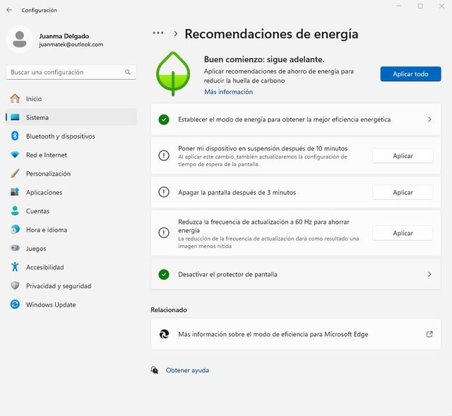 Windows analiza el uso de energía de tu equipo y te ofrece recomendaciones personalizadas para ahorrar batería.