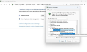 3. Ajusta la Administración de energía del estado de vínculos a Máximo ahorro de energía para cuando el PC esté en batería y a Ahorro moderado de energía cuando esté enchufado.