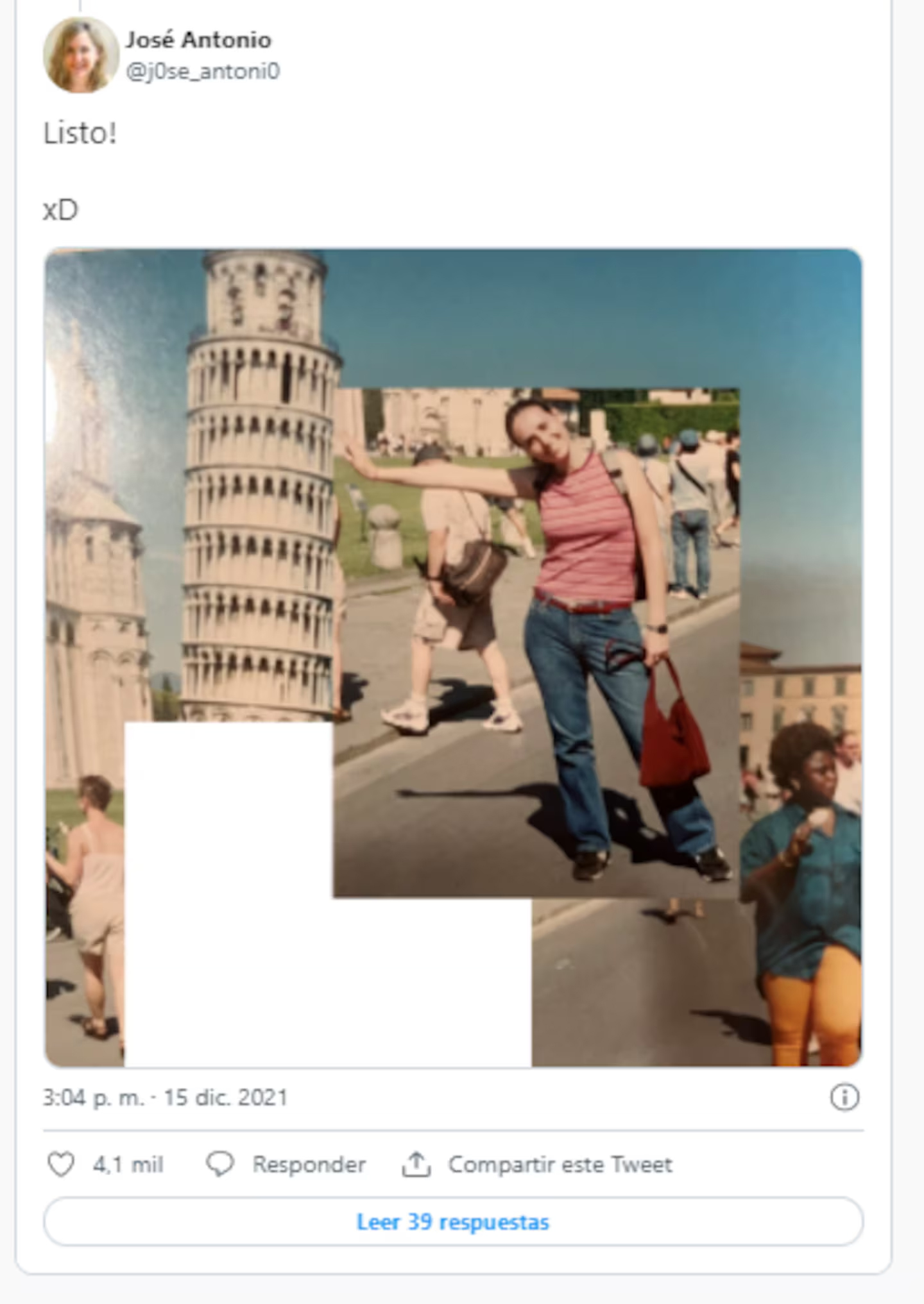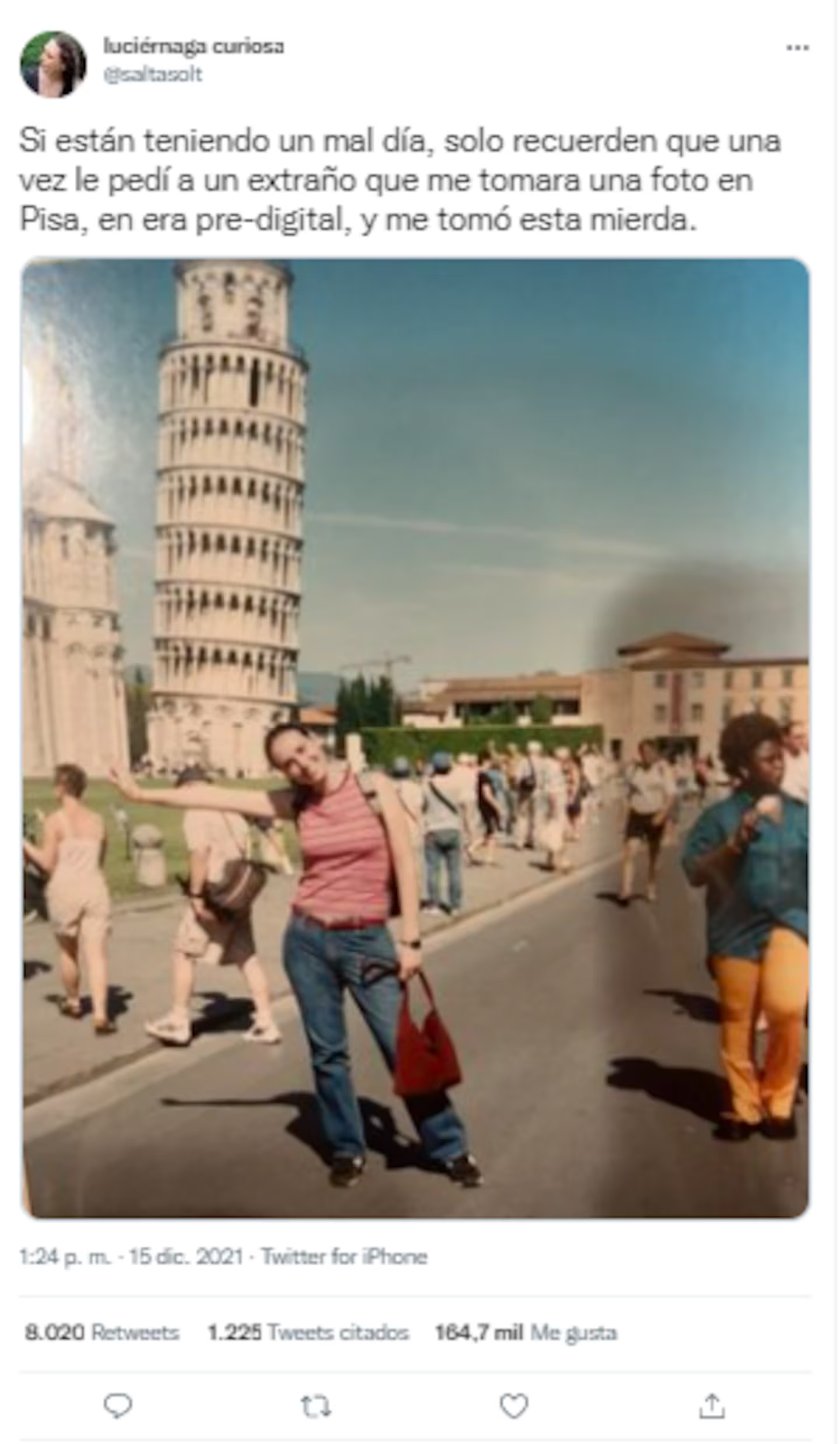 La mujer compartió la historia acompañada de la imagen en su cuenta de Twitter, escribiendo: “Si están teniendo un mal día, recuerden que una vez le pedí a un extraño que me tomara una foto en Pisa, en la era predigital, y me hizo esto”. Su intención era alegrar el día a sus seguidores con un toque de humor, pero no esperaba que su publicación explotara en popularidad, acumulando miles de interacciones y comentarios.