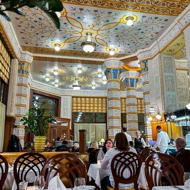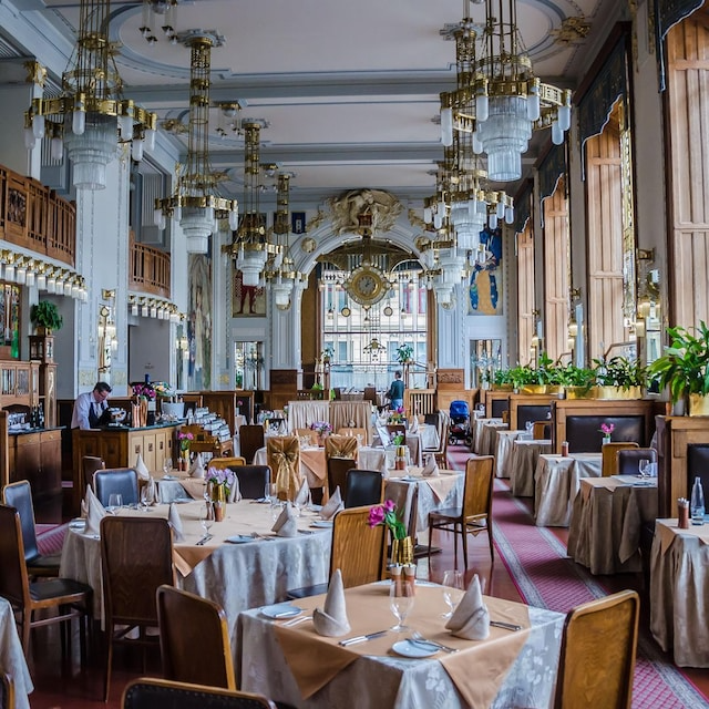 Ubicado en la majestuosa Casa Municipal (Obecní dům), en la céntrica plaza Náměstí Republiky, este café combina el refinamiento del art nouveau con la historia checa. En este edificio se proclamó la independencia de Checoslovaquia en 1918. Su interior cuenta con techos altos, ventanales, espejos y lámparas de cristal. Aquí se puede disfrutar de un café vienés acompañado de una tarta elaborada en el lugar, además de opciones ligeras como ensaladas o quiches.